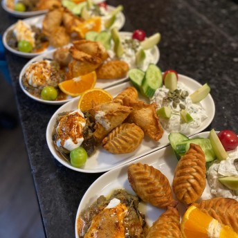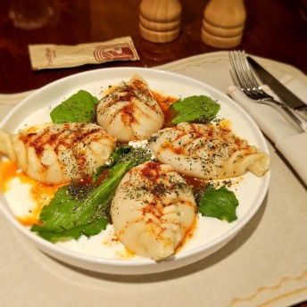 Yağda kızarmış patatesli ve peynirli özbek mantısı yanında kaşarlı patlıcan püre, kuzu kulaklı yoğur..